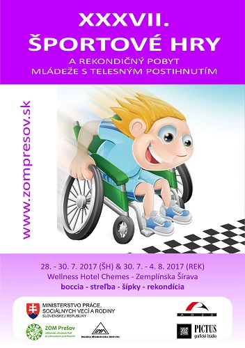 Milí priatelia, pozývame Vás na XXXVII. Športové hry mládeže s telesným postihnutím a následný rekondičný pobyt, ktoré sa budú konať vo Wellness Hoteli Chemes na Zemplínskej Šírave. Súťažiť sa bude v boccii, streľbe zo vzduchovky a šípkach. Účastnícky poplatok za „športové hry“ 28.- 30.7.2017 (piatok večera - nedeľa obed, 2 dni) pre jednu osobu je 50,- € (pre dieťa do 12 rokov je cena 35,- €) a za „rekondičný pobyt“ 30.7. - 04.8.2017 (nedeľa večera - piatok obed, 5 dní) pre jednu osobu je 125,- € (pre dieťa do 12 rokov je cena 80,- €). V cene je ubytovanie v dvoj a trojposteľových izbách, celodenná strava a služby wellness (plavecký a detský bazén, veľká vírivka a soľná inhalácia) čase 09:00 - 16:00 hod. Doprava je individuálna. V prípade záujmu o účasť na oboch akciách (alebo jednotlivo), informujte sa na zompresov@zompresov.sk alebo na tel: 051 77 014 99. Prihlásiť sa je potrebné čo najskôr, najneskôr však do 10.07.2017. Tešíme sa na Vás!