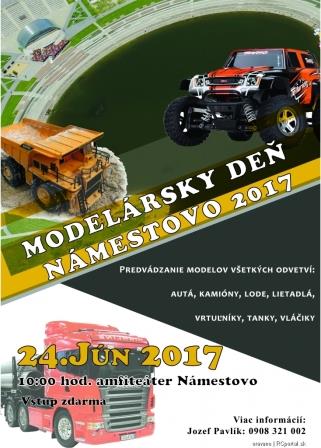 Pozývame malých aj veľkých na Námestovský modelársky deň, ktorý sa uskutoční dňa 24. júna 2017 pri amfiteátri v Námestove od 10:00 hodiny do 16:00 hodiny. Modelári z celého Slovenska budú predvádzať modely na diaľkové ovládanie v kategóriách – kamióny s návesmi, tanky a bojová technika, stavebné stroje, lietadlá, vrtuľníky, off-roadové automobily, vláčiky a lode. Uskutočnia sa ukážky bojovej techniky s pyrotechnikou, preteky kamiónov, plavba modelových lodí. Vstup zdarma.