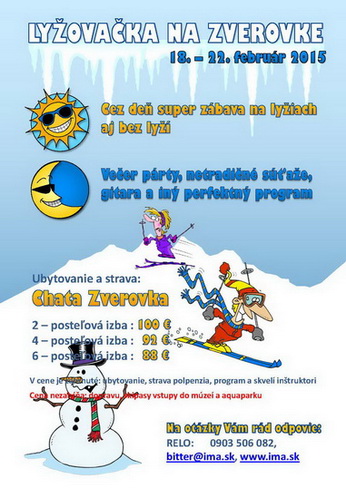 Cez deň super zábava na lyžiach aj bez lyží Večer párty, netradičné súťaže, gitara a iný perfektný program Ubytovanie a strava: Chata Zverovka cena : 2 – posteľová izba : 100 € 4 – posteľová izba : 92 € 6 – posteľová izba : 88 € V cene je zahrnuté: ubytovanie, strava polpenzia, program a skvelí inštruktori Cena nezahŕňa: dopravu, skipasy vstupy do múzeí a aquaparku Na otázky Vám rád odpovie: RELO: 0903 506 082, bitter@ima.sk