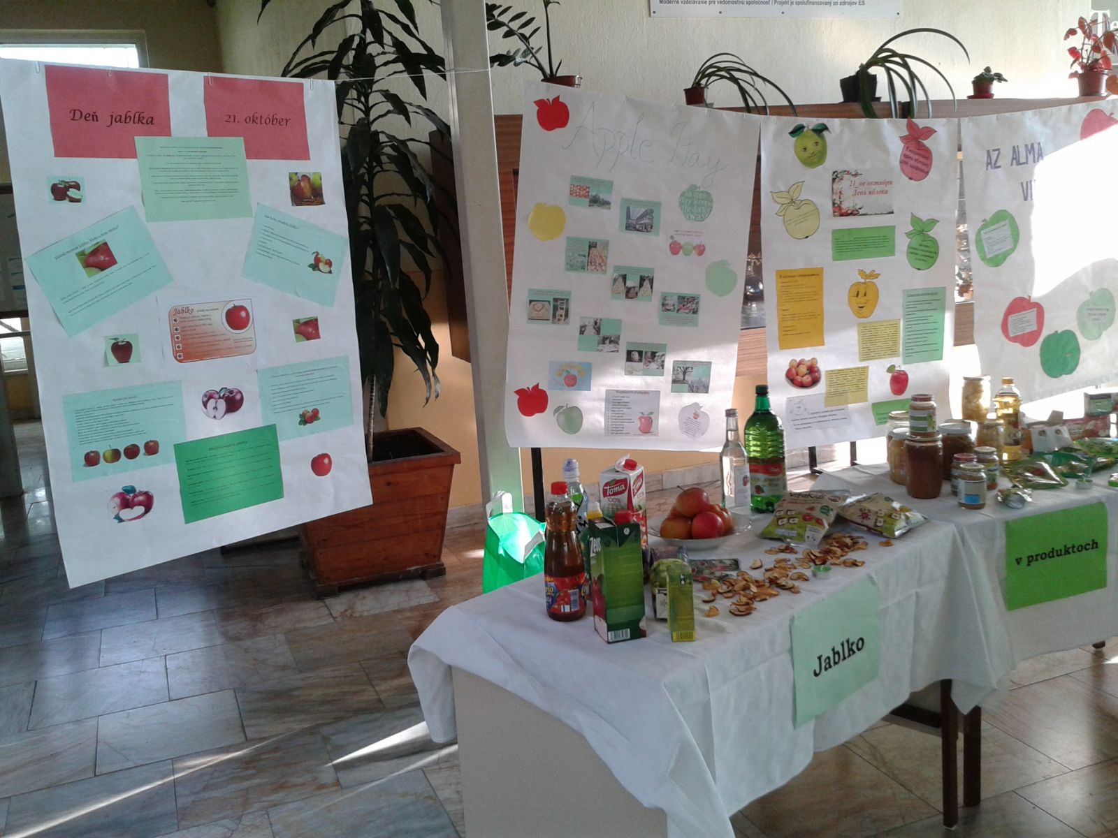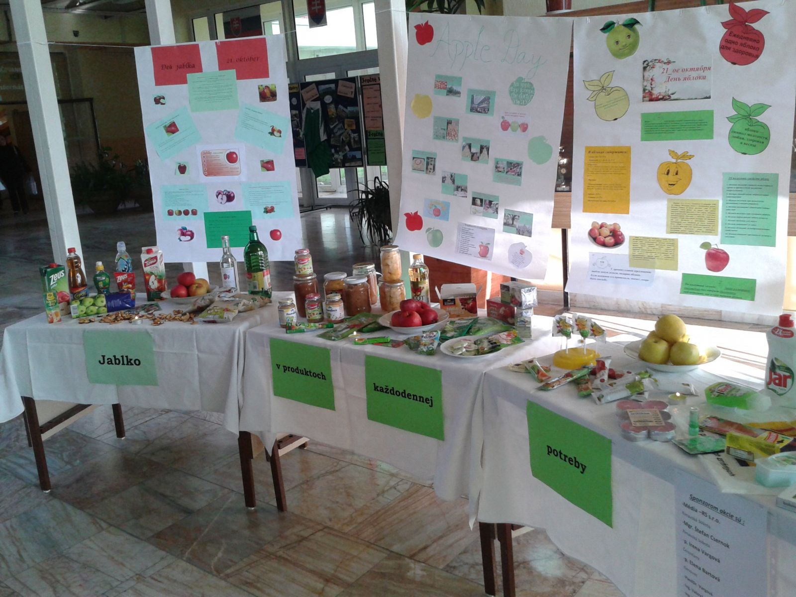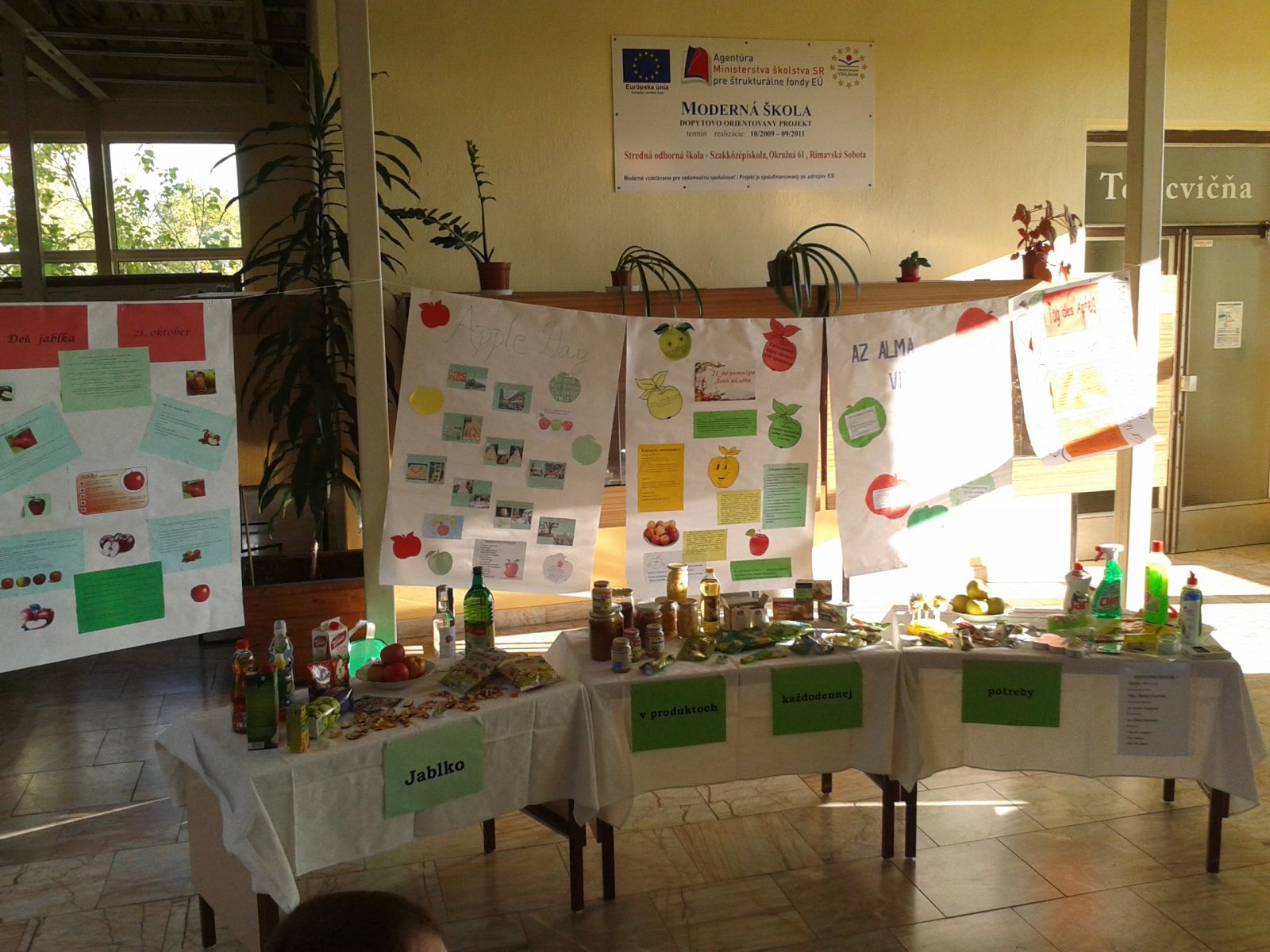 V priestoroch školy sme zorganizovali celý rad akcií k tomuto sviatku. Vo vestibule školy bola pripravená výstava produktov, v ktorých sa jablko alebo jablčná vôňa využívajú. Členovia OKC ale aj návštevníci školy sa dozvedeli, že z jablka sa vyrábajú: džúsy, ochutené vody, cukríky, lízatká, žuvačky, šumienky, keksíky, pelendreky, jablčné chipsy. Súkromní sponzori nám prispeli jablčným vínom, svadobnou jablkovicou, kompótmi, výživou a strúhanými jablkami. V potravinách sme kúpili aj jablčný ocot, sirup a čaje. Okrem potravinárskych výrobkov sa s vôňou jablka stretneme aj v drogistickom tovare, ako sú rôzne šampóny, mydlá, peny do kúpeľa, balzamy na pery. Veľa účastníkov akcie sa čudovalo, že s vôňou jablka je aj Savo, Bref, Jar, Pur, Clin. Mládež v obchodoch objavila aj sviečky, vône do auta a osviežovače vzduchu. Informácie o sviatku, jablkách a ich výživovej hodnote si mohli všetci prítomní v škole prečítať na nástenkach v rôznych jazykoch: v slovenčine, maďarčine, angličtine, nemčine a ruštine. Žiacka školská rada vyzvala žiakov školy, aby vytvorili rekord v jedení jabĺk na jednom mieste. Každý žiak, ktorý sa chcel akcie zúčastniť, musel byť v rovnakom čase na určitom mieste a doniesť si svoje jabĺčko, ktoré na mieste zjedol. Akcie sa zúčastnilo 128 žiakov školy.