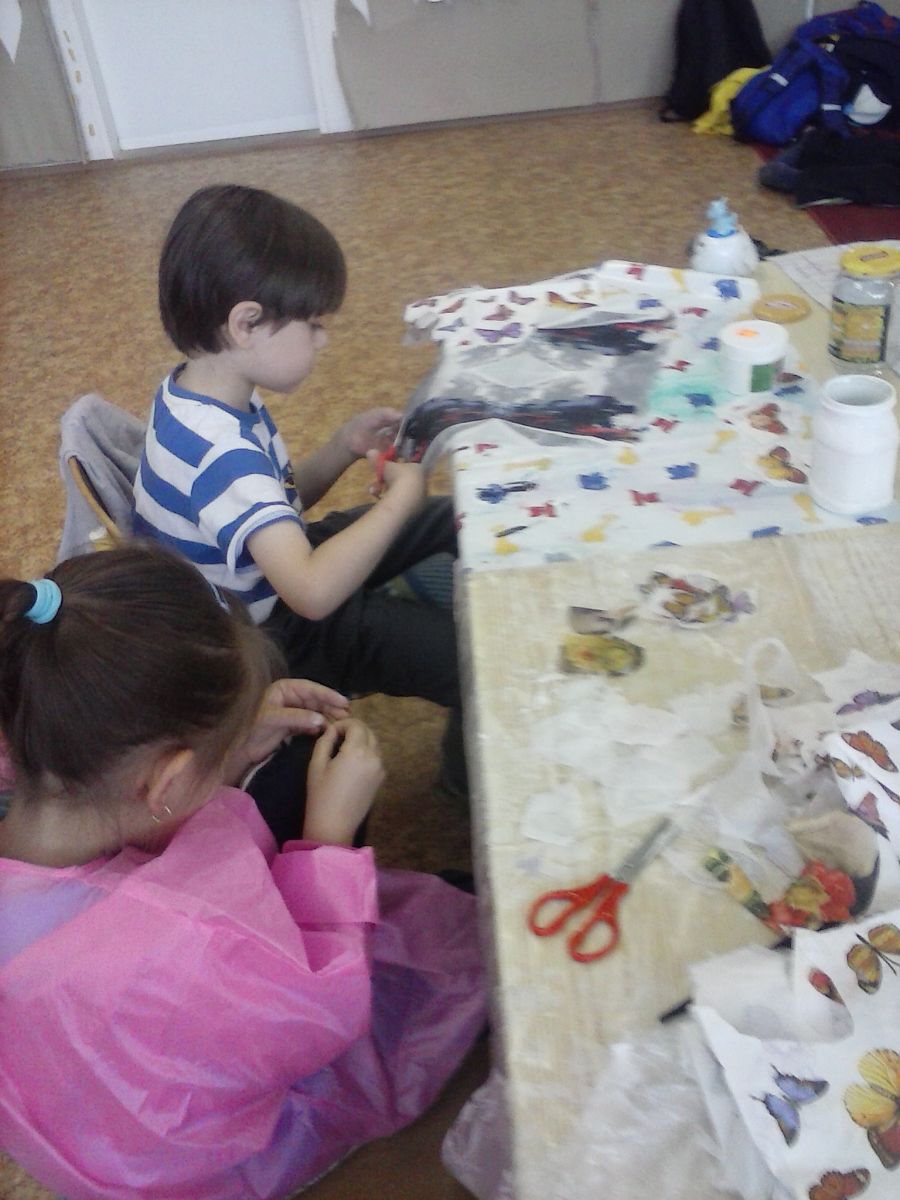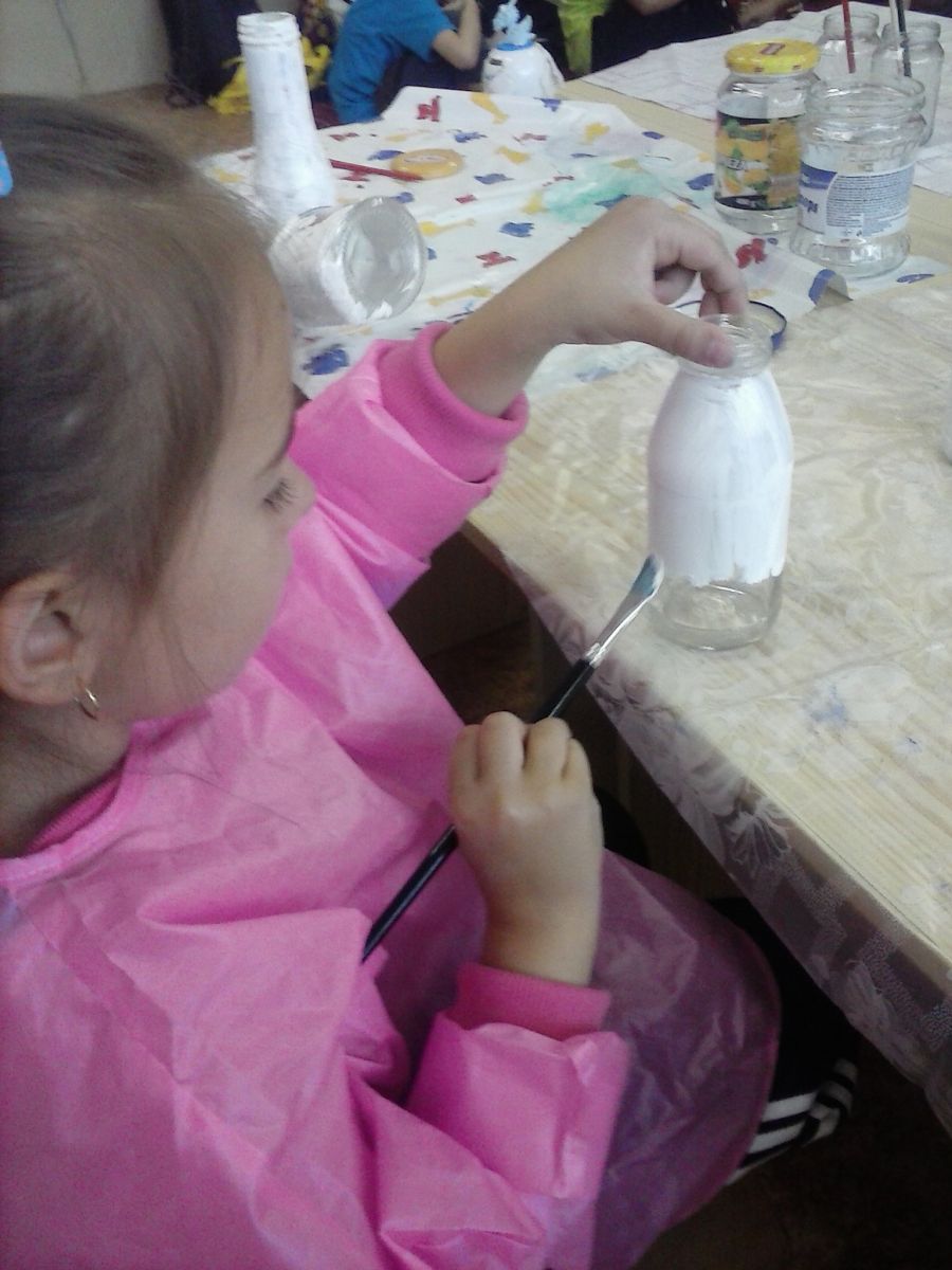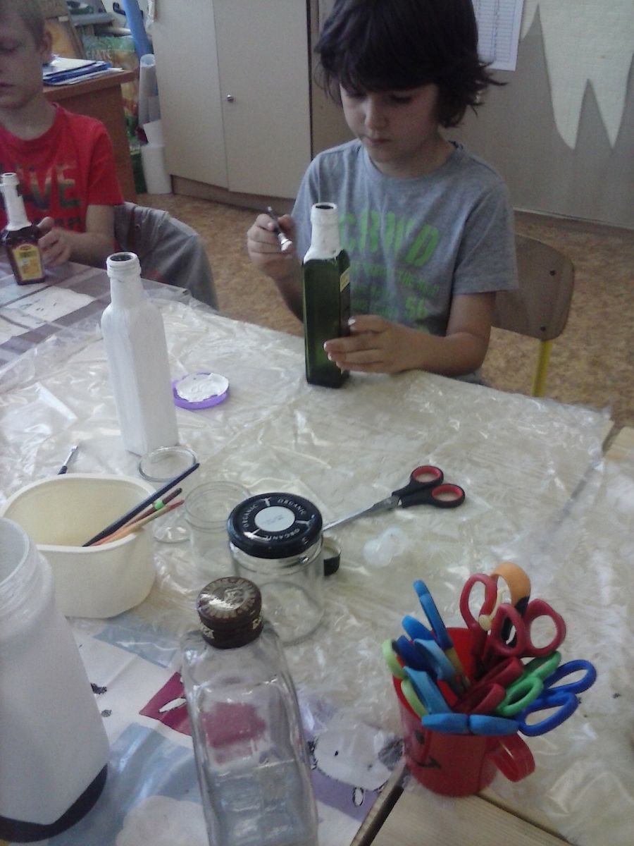 Prvé bolo SKLO. Počas vychádzky v dedine budeme vymieňať jednu fľašu skla za iný tovar ... čo všetko si za to vymenia. Pozorovať pohodený odpad o skla. Po vychádzke sme maľovali na sklo, zdobili zaváraninové fľaše a iné sklo.