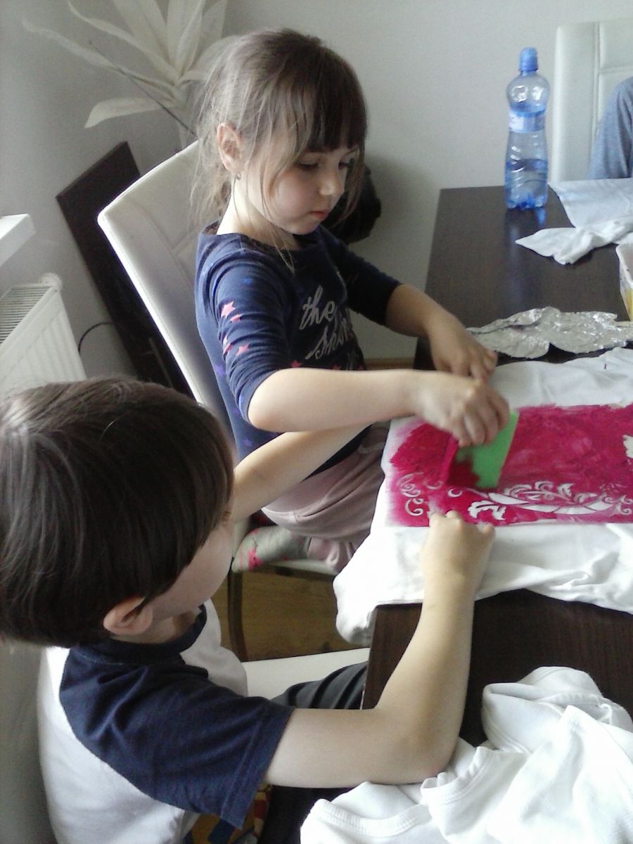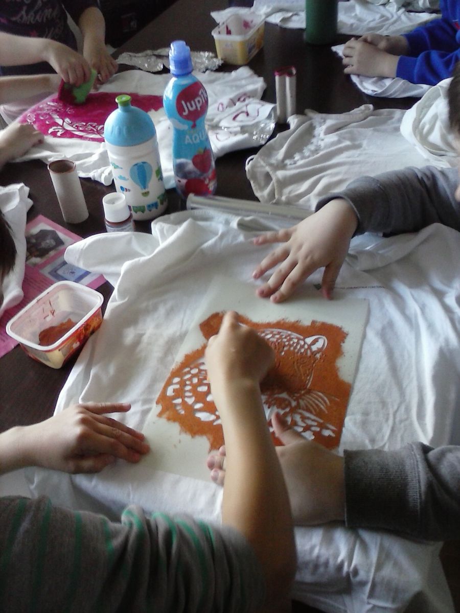 Štvrtý týždeň TEXTIL spojený s batikovaním a maľbou starých tričiek, sukní či nohavíc, plachiet. EKO textil – staré tričká sme si vyzdobili aby boli ako nové a staré plachty sme premenili na nové šatky.